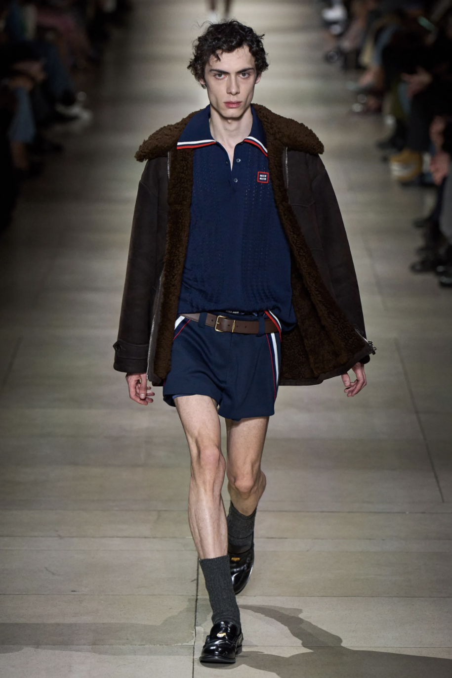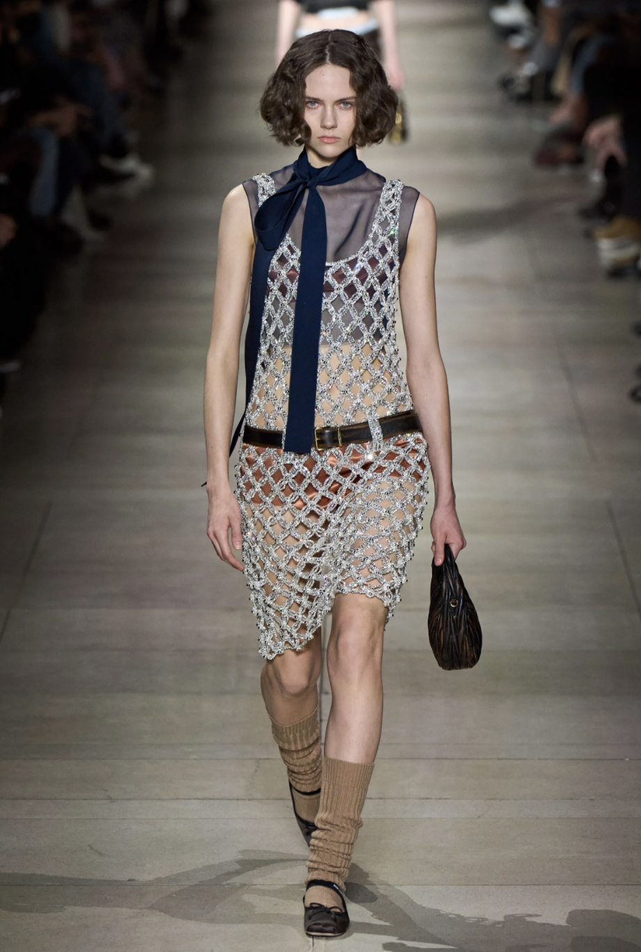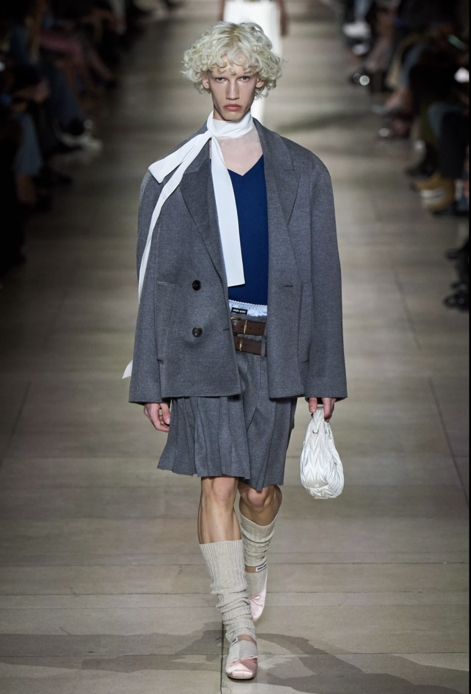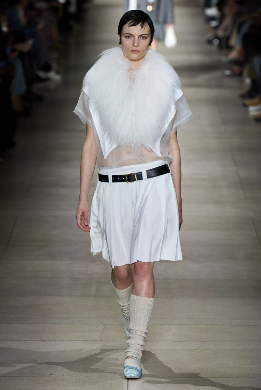 这次Miu Miu给女孩的冬季形象提供了较为明确的导向,打破了办公室的着装规范,目光聚焦于运动网球场,超短款、低腰Y2K裙子和带有透明蕾丝镶片的上衣传达的讯息是:随时充满活力才是女孩们秋冬应有的状态。而随着主题出现新变化,羊毛、蛇皮印花、染色皮革,以及蓬松的人造皮草翻领显示了Miu Miu更加多样化的性别表达,证明轻薄的面料和轮廓也适用于中性身材。而仅有的几位男模们穿着Miu Miu短款绞花针织衫和小夹克出场,为大秀带来更为丰富饱满的效果。