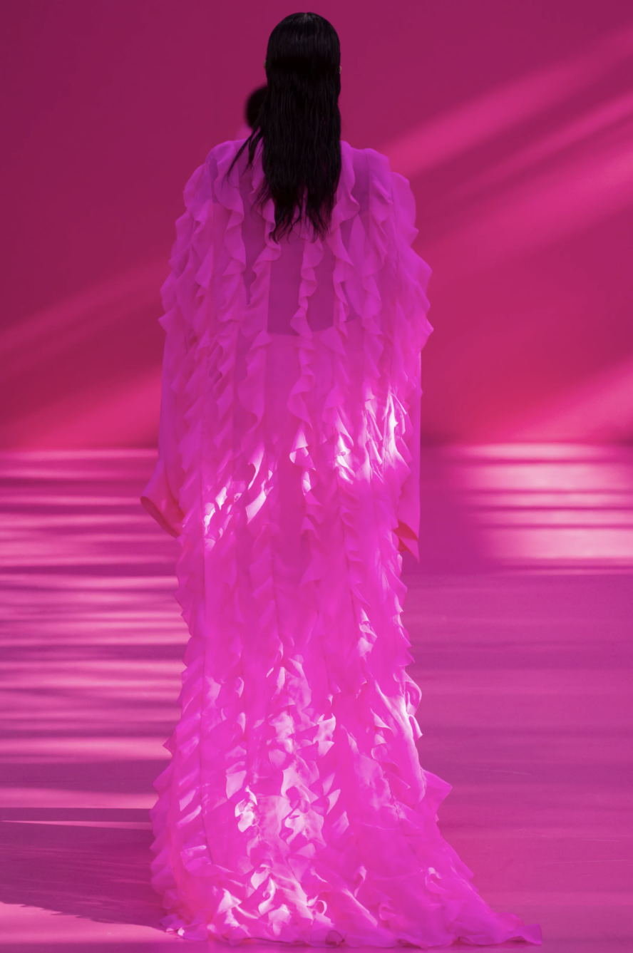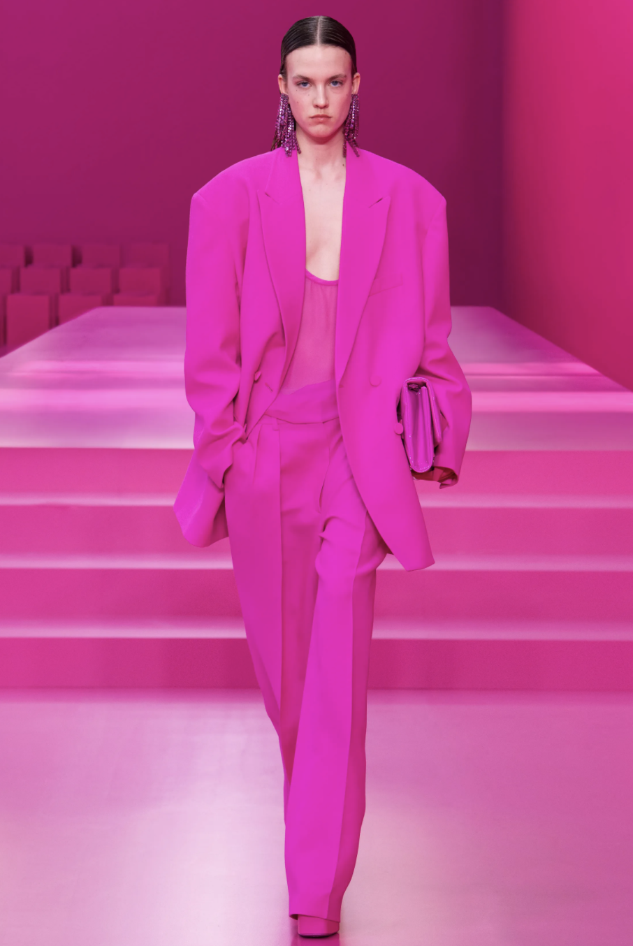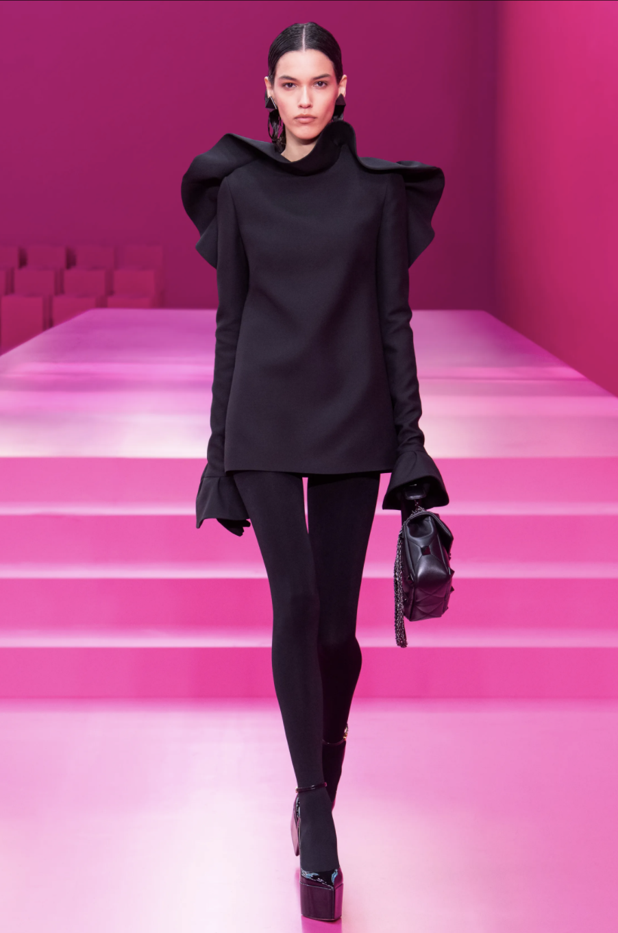 Valentino创意总监Pierpaolo Piccioli为Valentino2022秋季成衣系列选用了极端的色彩策略。T台呈现一种特别的高饱和度的粉紫色,包括前半场出现的所有服饰单品,而随着一位身着黑靴、黑紧身裤,黑色荷叶边裁剪上衣的模特出现,此前单一色的粉紫依然暂留于视网膜,极彩突然切换入全黑色调,此刻眼睛能看到两种颜色微弱的叠合,似看到幻想般的视觉体验极其新颖,或粉,或黑,Pierpaolo Piccioli自己也说:“我想选择所谓的“单调”来消除其他干扰,并将观众的注意力集中在区分轮廓和细节之间的差异上。”