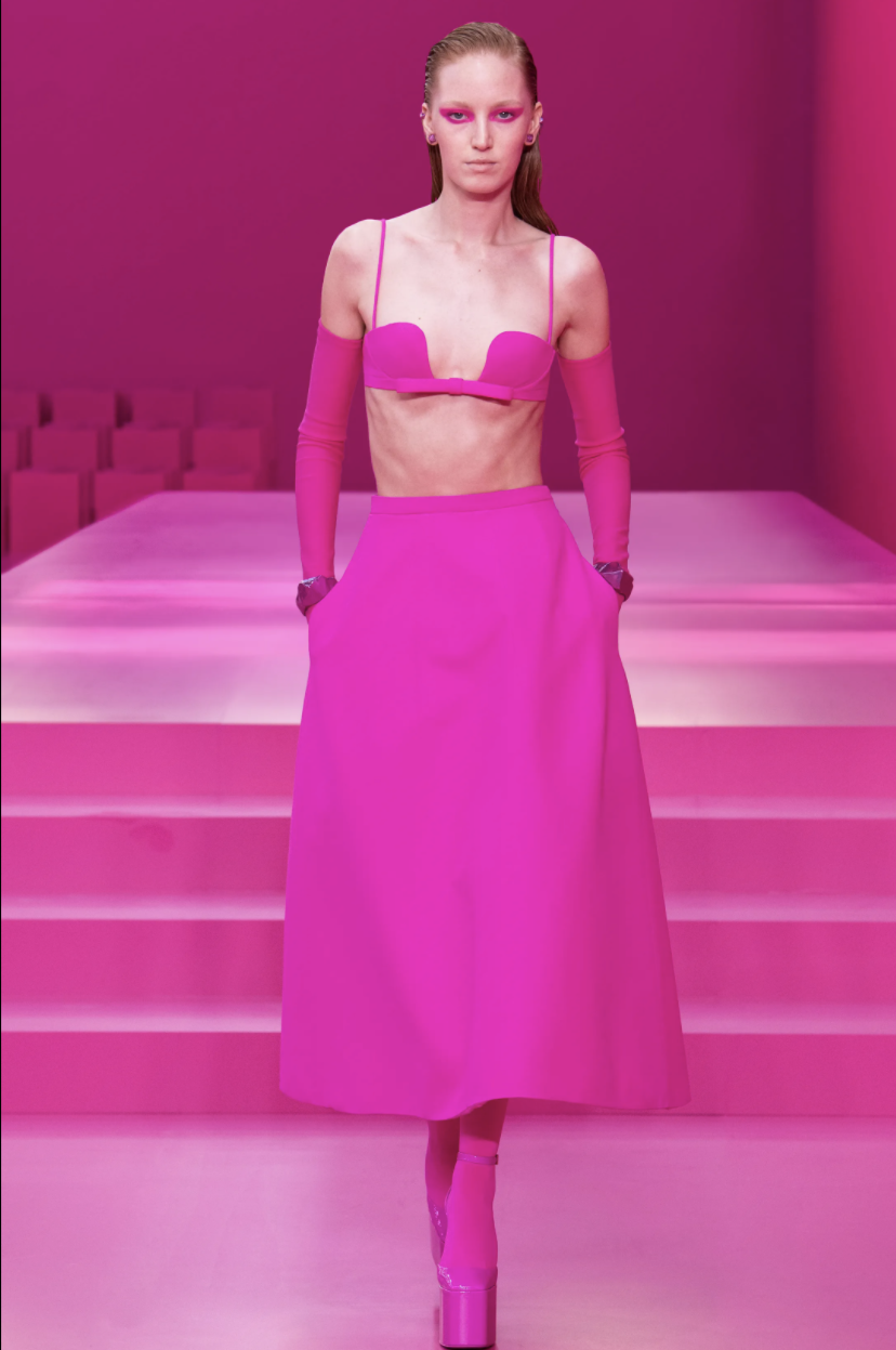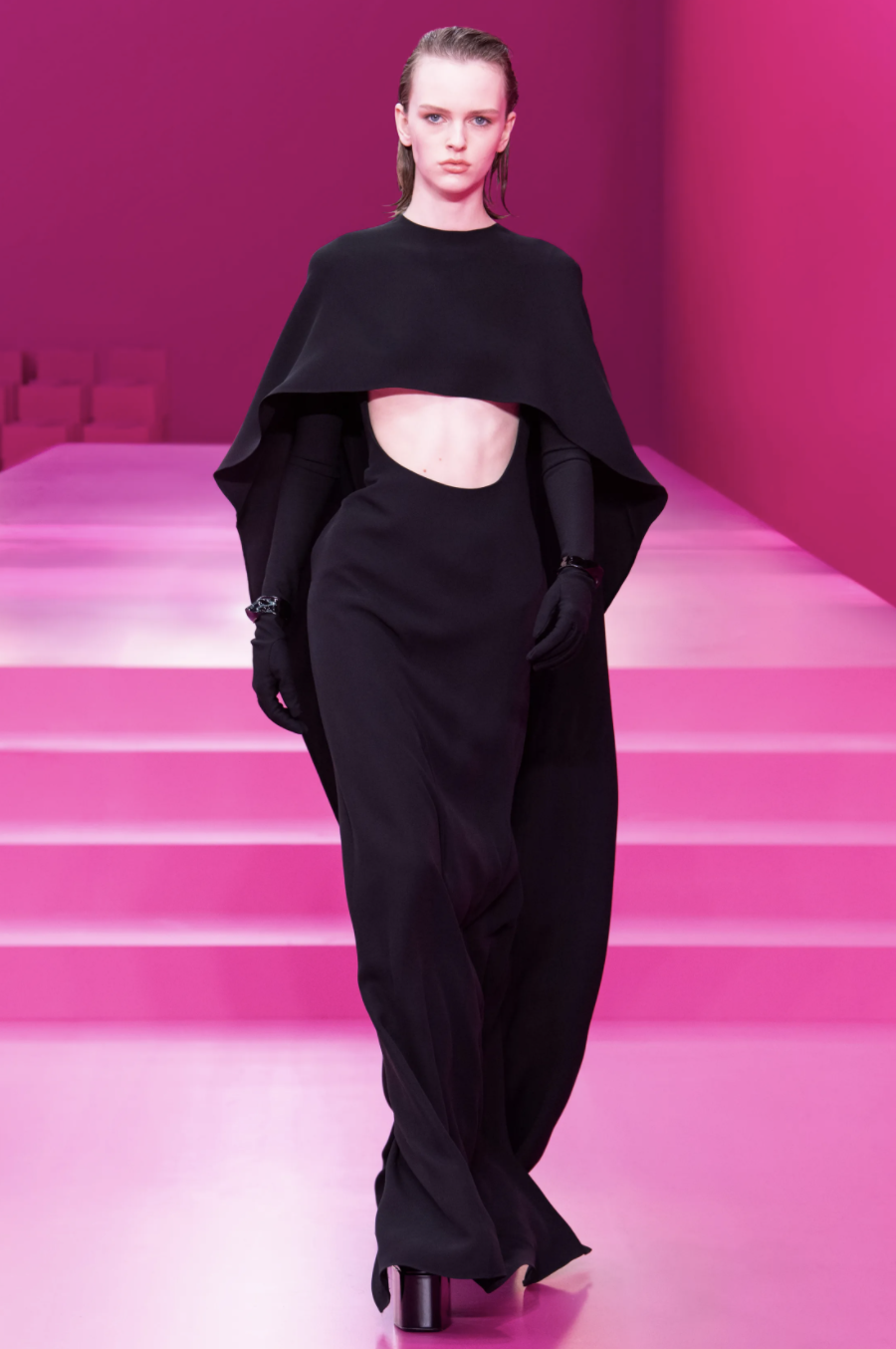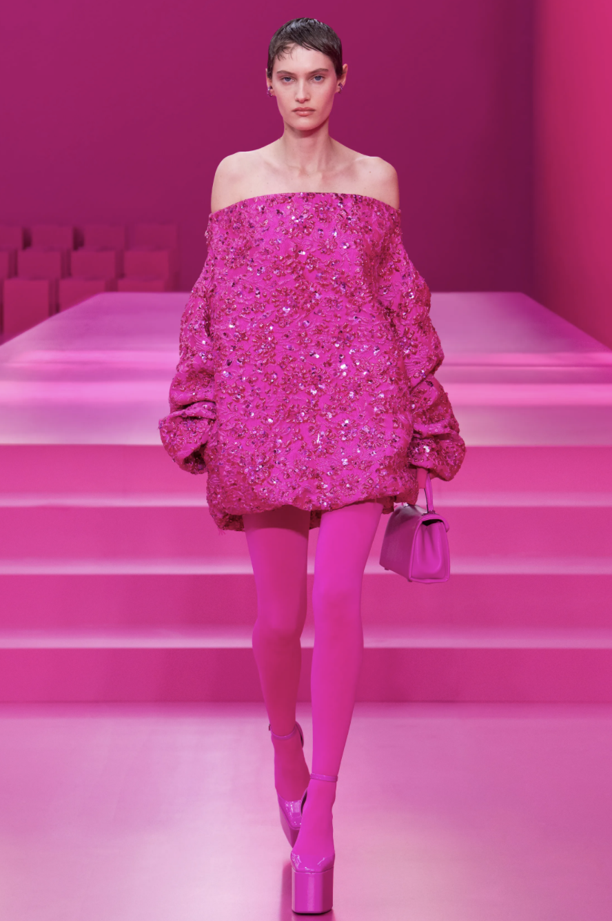 Valentino创意总监Pierpaolo Piccioli为Valentino2022秋季成衣系列选用了极端的色彩策略。T台呈现一种特别的高饱和度的粉紫色,包括前半场出现的所有服饰单品,而随着一位身着黑靴、黑紧身裤,黑色荷叶边裁剪上衣的模特出现,此前单一色的粉紫依然暂留于视网膜,极彩突然切换入全黑色调,此刻眼睛能看到两种颜色微弱的叠合,似看到幻想般的视觉体验极其新颖,或粉,或黑,Pierpaolo Piccioli自己也说:“我想选择所谓的“单调”来消除其他干扰,并将观众的注意力集中在区分轮廓和细节之间的差异上。”