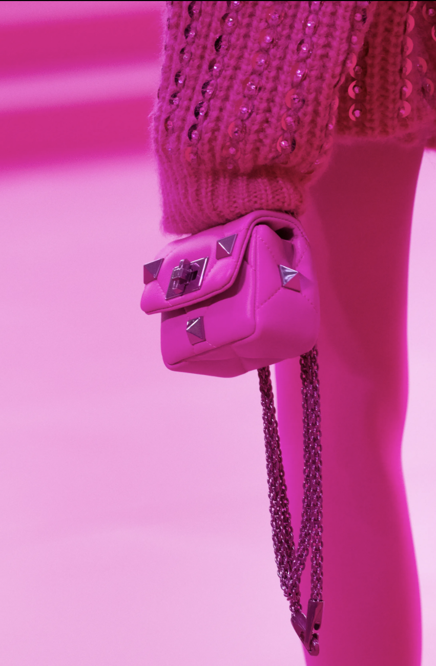 配件里的粉/黑同样无所不在,手袋的一些尺寸和细节相继增大,而部分款式却设计成更加小巧的样子,再缀上一颗巨大的铆钉袋扣,视觉上呈现放大镜下的画面。黑色廓形剪裁是秋季流行时尚的重要组成部分,当成衣突然转向黑色,服饰与T台形成对比鲜明的轮廓区分,人们的目光得以从背景板的粉色调脱离,聚焦于黑色系单品,Pierpaolo Piccioli将蕾丝上衣或扭纹薄纱与裤子搭配在一起,给人一种现代感,展示了华伦天奴对潮流趋势的优雅追求和敏感捕捉。