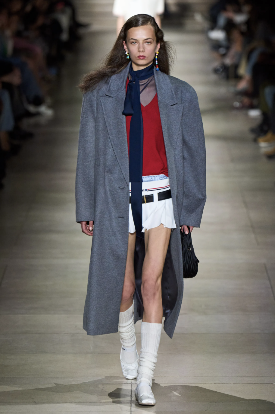 运动条纹上衣饰以特别的水手服的衣领,同样以露脐装为特点,但在版型上更加宽松舒适;配套的及膝苏格兰百褶裙,其裙摆被加宽,在以白色基调为基调的裙装上点缀棕色皮带,装饰的同时提升身材比例。而用一件超大号西装外套,搭配内衣、迷你裙、或晚礼服,是对MiuMiu经典风格的延续,这样的搭配也逐渐成为时尚追求者衣柜中的必备款式,时尚也许会稍纵即逝,但对风尚的意识确是永恒的,购买经典服饰也不可能会让人后悔。