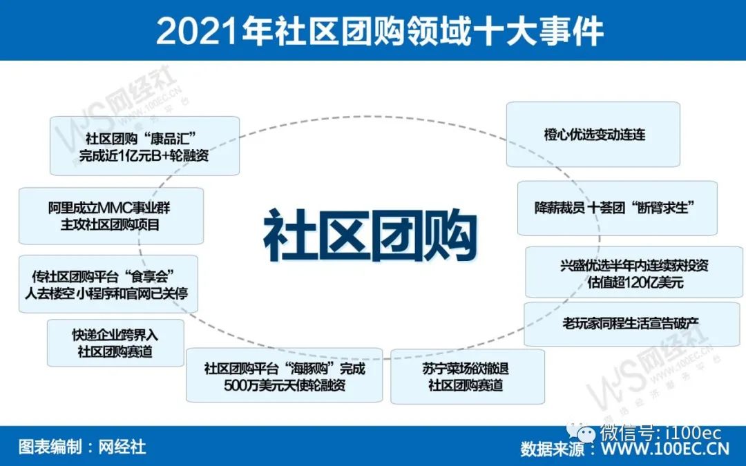 2021年,社区团购赛道上有起有落,兴盛优选半年内连续三次获投资、阿里成立MMC事业群主攻社区团购项目、老玩家同程生活宣布破产、呆萝卜停业、食享会人去楼空、十荟团裁员求生、橙心优选大幅亏损......