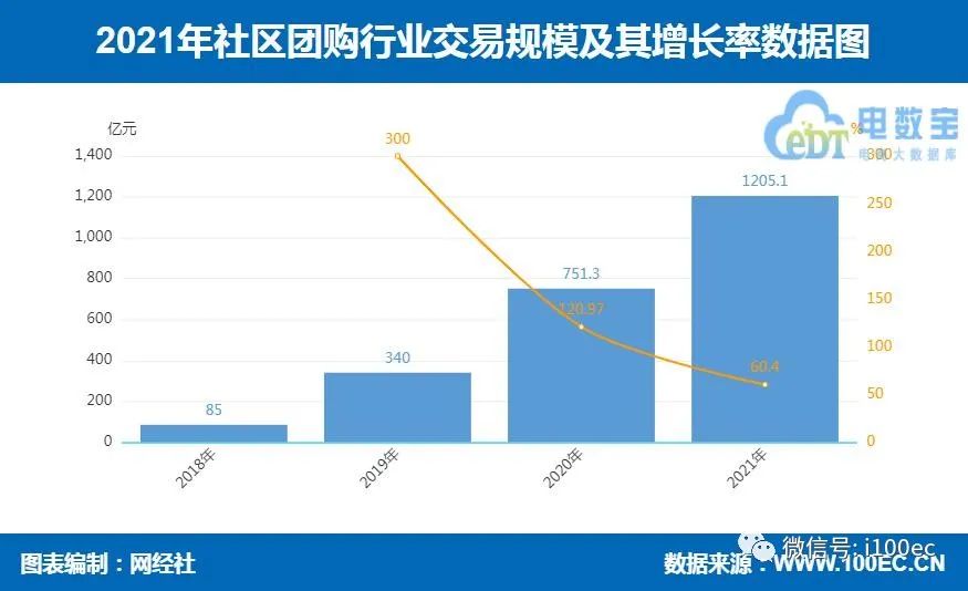 报告显示,2021年中国社区团购市场交易规模达到1205.1亿元,同比增长60.4%。