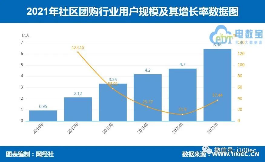 据网经社旗下电商大数据库“电数宝”监测数据显示,2021年社区团购用户规模达到6.46亿人,同比增长37.44%。