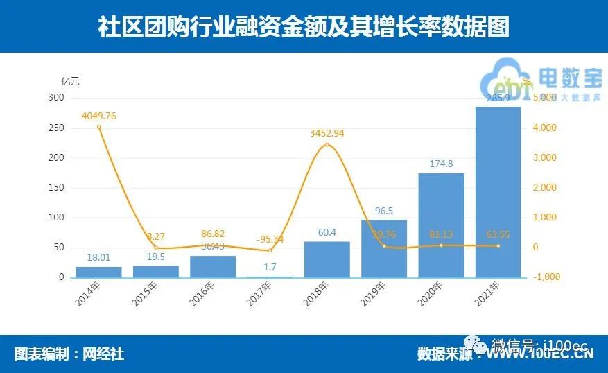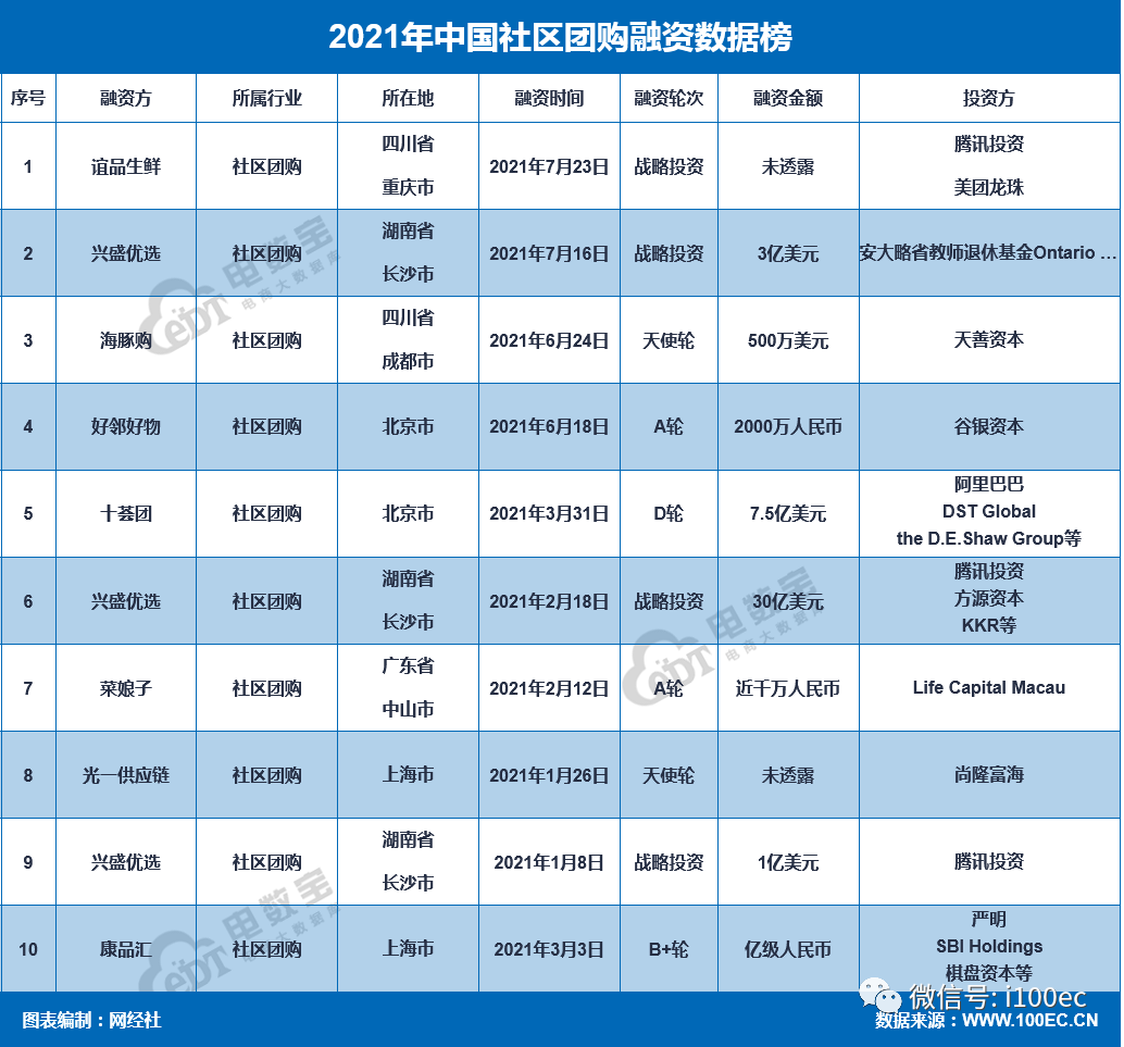 报告显示,2021年我国社区团购融资数为10起,总额为285.9亿元,同比增长63.55%。涉及的平台包括:谊品生鲜、兴盛优选、海豚购、好邻好物、十荟团、菜娘子、光一供应链、康品汇。