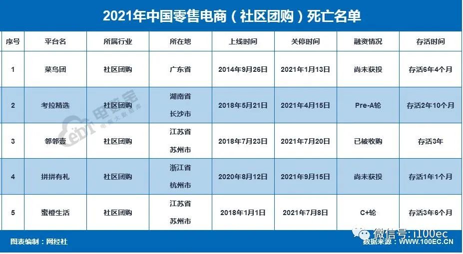 据网经社“电数宝”电商大数据库显示,2021年社区团购“死亡”数为5家,分别为菜鸟团、考拉精选、邻邻壹、拼拼有礼、蜜橙生活。(注:本数据库定义的“死亡”包括公司破产、倒闭、重大重组、创始人跑路、平台关停或停更等)