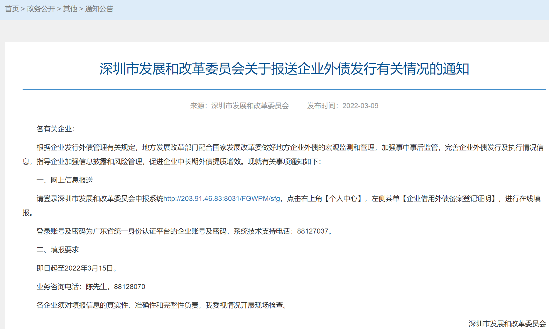 深圳市发展和改革委员会9日在其官网上发布《关于报送企业外债发行有关情况的通知》,要求各有关企业即日起至2022年3月15日登录深圳市发改委申报系统填报企业外债发行有关情况。