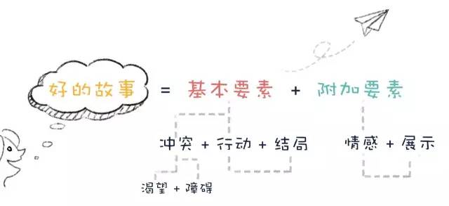 好的故事遵循同样的套路:基本要素(冲突<渴望、障碍>、行动、结局)+附加要素(情感、展示)。