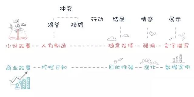 商业故事与小说故事遵循同样的套路,但有四大不同:渴望是挖掘的而不是人为制造的;目的性很强所以故事是从结局倒推的;并非所有故事都需要情感;展示往往包含很多数字和案例。