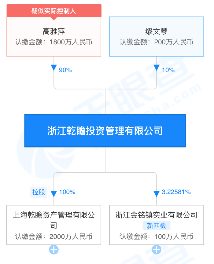 天眼查显示,叶茂杨为浙江乾瞻投资管理有限公司(下称乾瞻投资)的法人代表人,同时也是董事长兼总经理。另外叶茂杨持有绍兴宏铭企业管理合伙企业(有限合伙)(下称绍兴宏铭)51%的股份,并担任法定代表人。