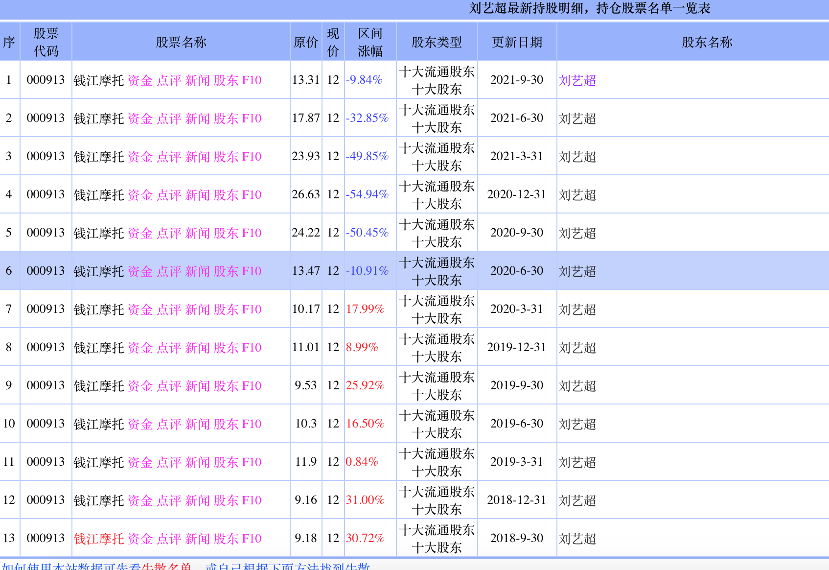 上文提到的“蒋某良”,在钱江摩托的历史股东名单中,2016年半年报里恰好有名为“蒋水良”的股东。进一步查询发现,这位自然人蒋水良,在2014年三季报中曾出现在科力远的股东名单中,并持续持股至2021年三季末,最新情报待定。而在科力远2014年半年报中,叶茂杨也曾亮过相,2014年一季报中,缪文琴的名字也出现过,其持股还一直持续到了2018年。那么高雅萍呢,在科力远的记录中,高最早出现在2013年年报中,和蒋水良一样,在2021年三季报中依然在股东名单上。