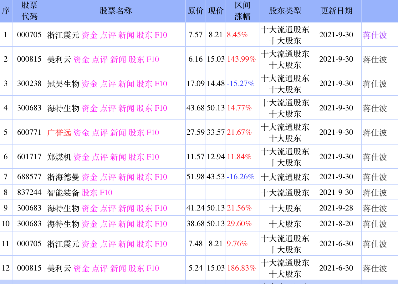 另外在梳理中可以看到,自然人股东季爱琴,以及华融国际信托有限责任公司-华融·汇盈32号证券投资单一资金信托,也多次出现在上市公司的股东名单中,与上述股东的持仓交集明显,诸如美利云、钱江摩托、科力远、冠昊生物等。而蒋仕波也在冠昊生物的股东名单上。