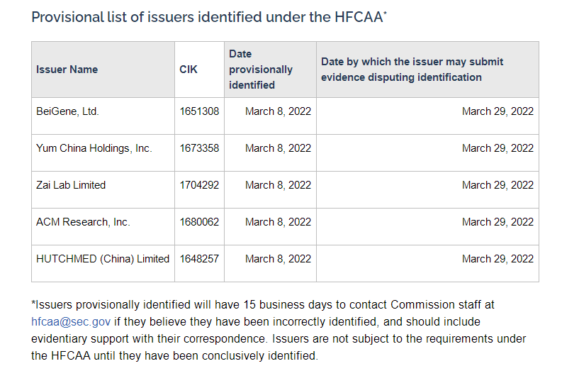 近日,美国证券交易委员会(简称SEC)将几家中概股公司列入《外国公司问责法》(简称HFCAA)的暂定清单,包括百济神州、百胜中国、再鼎医药、ACM Research(盛美半导体 )、和黄医药。列入暂定清单从3月8日算起。