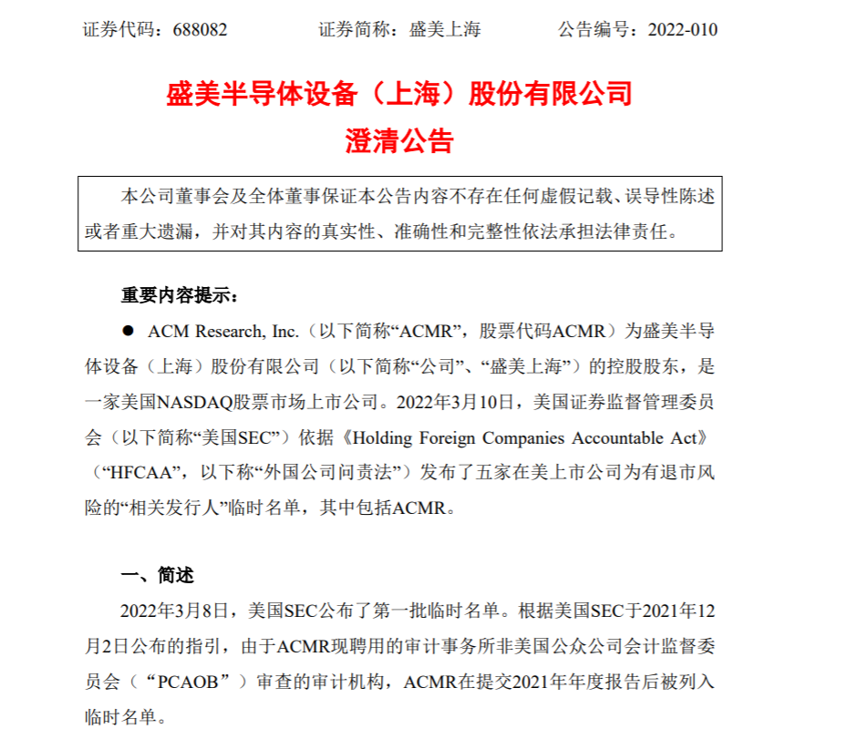 盛美上海称,ACM Research, Inc.为盛美半导体控股股东,是一家美国NASDAQ股票市场上市公司。ACMR出现在临时名单上并不意味着ACMR将很快被摘牌。根据美国SEC的指导方针,交易禁令最早可在2024年生效,即ACMR连续三年(2022年、2023 年和2024年)出现在美国SEC临时名单上后。