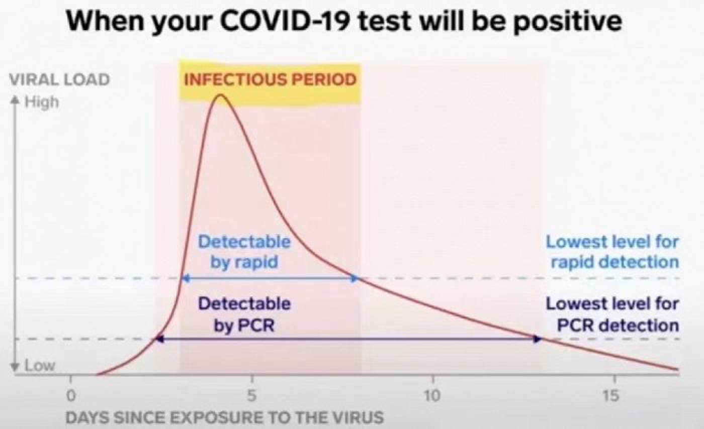 除了检测对象不同外,抗原检测与核酸检测主要的差异在于感染时间。如下曲线图所示,横轴表示与病毒接触的时间,纵轴表示病毒载量,曲线表示在不同时期内的病毒载量变化情况。观图可知,病毒载量较高的时间为感染后的3-7天。其中,快速检测(Detectable by rapid,例如抗原检测)可检测出阳性结果的时间为感染后3-7天;PCR检测(Detectable by PCR,例如核酸检测)可检测出阳性结果的时间为2-14天。