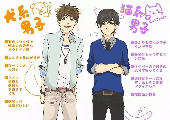 日本的二次元文化将这种猫狗性格演化到了一种极致。猫系和犬系是一种划分性格的萌属性设定,萌娘百科将“猫系萌娘”的性格描述为“冰山傲娇”,而犬系萌娘的性格则是“阳光元气”。你一定见过“猫系男/女友”和“犬系男/女友”这样的说法。而在腐文化中,狗猫更与攻受设定密切相关,与“忠犬”标签相对的,是猫耳猫尾等一系列猫咪拟人。几乎所有动漫角色都可以被套进猫和狗的大框架里。