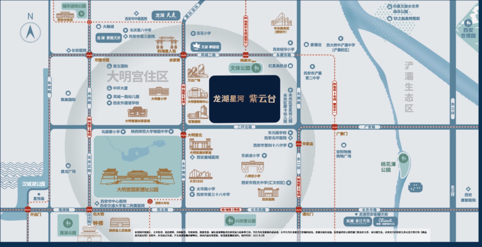 今年2月中旬,龙湖发布了西安4个纯新盘的案名,其中就包括去年10月份在曲江大明宫板块拿下的这宗优质地块的项目,案名为龙湖星河紫云台。