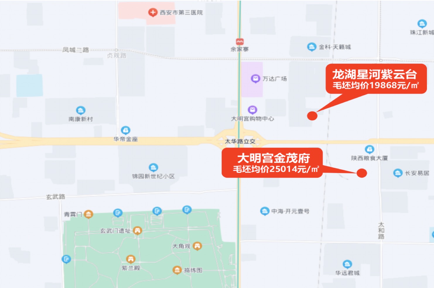 第一,该板块成交的地块所限定的房价。除了龙湖在曲江大明宫板块拿地之外,2021年12月份中国金茂在该板块拿地2宗,毛坯商品住宅的销售价格约2.5万元/㎡。
