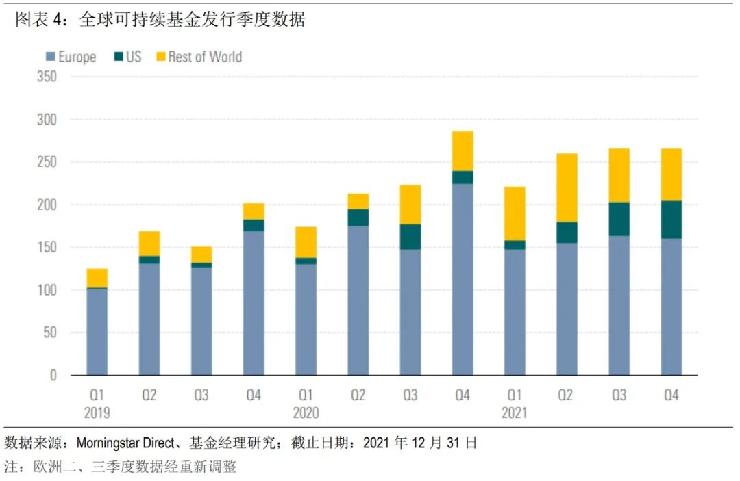 ●产品开发保持强劲,四季度全球共新推出了266只可持续基金。管理人也继续将一些传统基金转型并重命名为可持续基金。