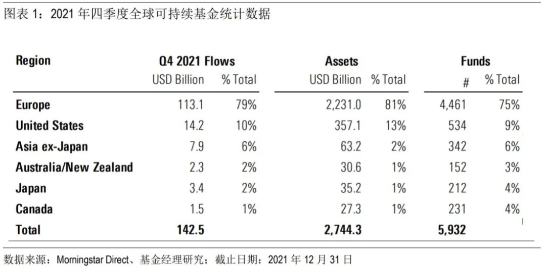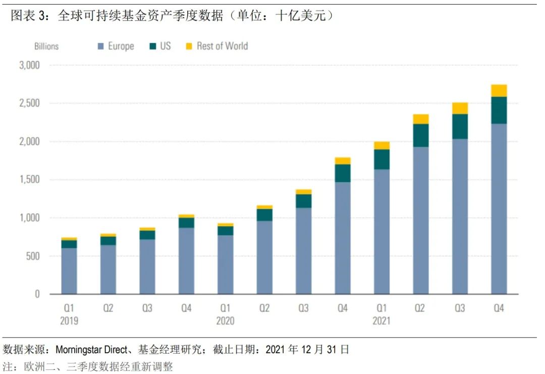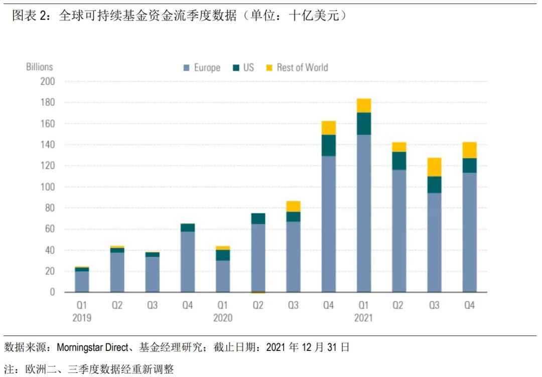 ●2021年12月数据显示,全球可持续基金资产在第四季度以9%的增速增至2.74万亿美元。