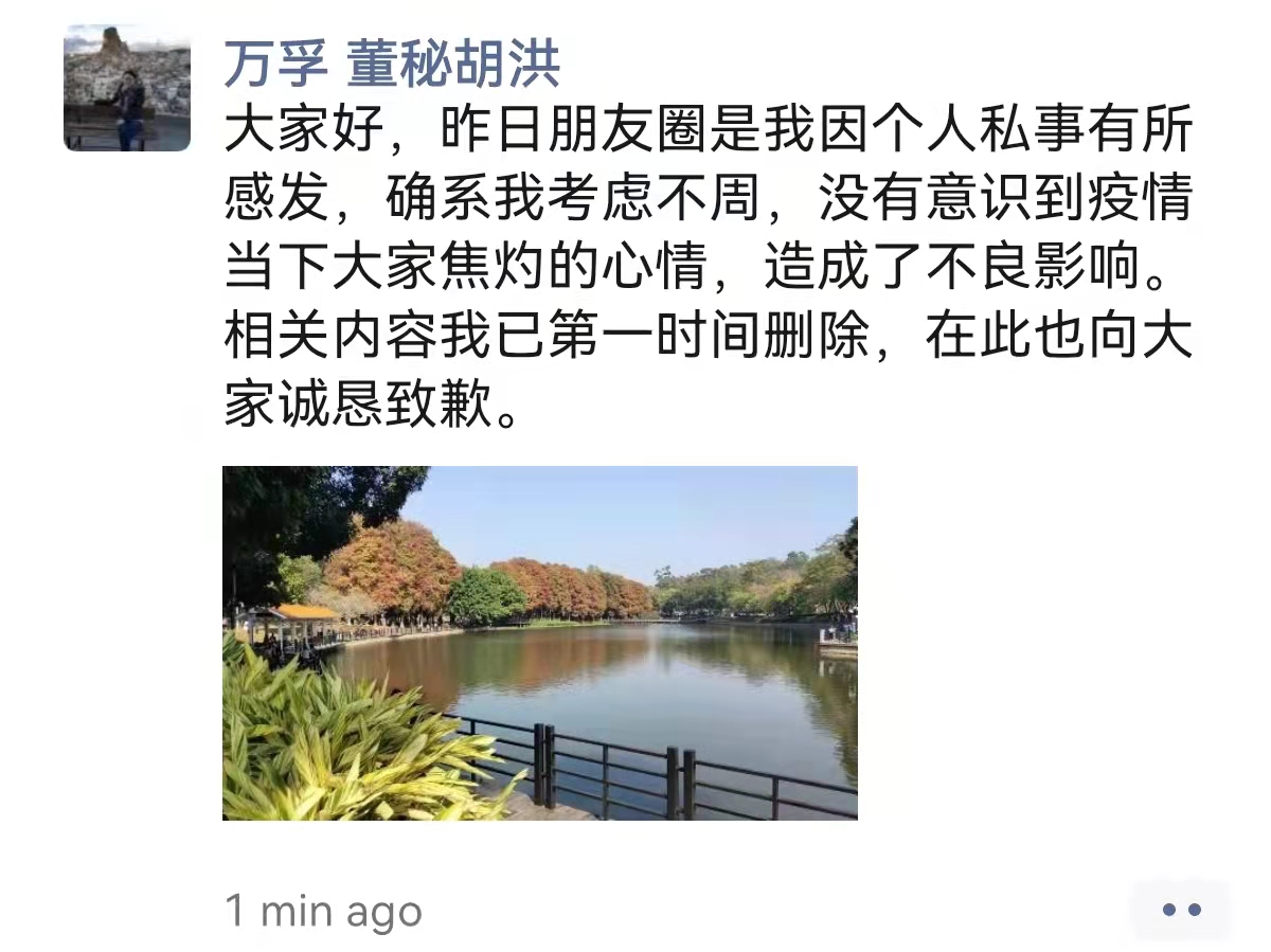 3月13日中午,胡洪在其微信朋友圈致歉称:“昨日朋友圈是我因个人私事有所感发,确系我考虑不周,没有意识到疫情当下大家焦灼的心情,造成了不良影响。相关内容我已第一时间删除,在此也向大家诚恳致歉。”