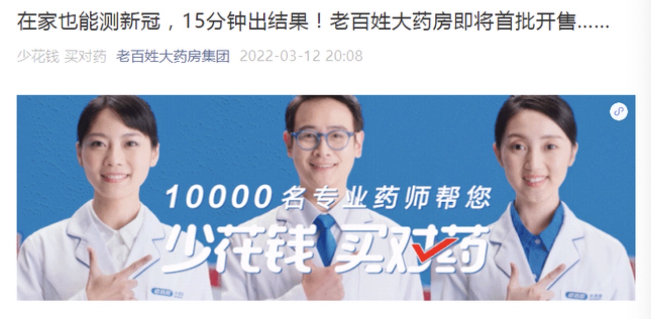 从3月12日晚间起,老百姓大药房、大参林、益丰大药房等多年连锁药房发布消息称,已经与万孚生物等获批厂家达成合作,自测产品将近日首发或近日上架销售。