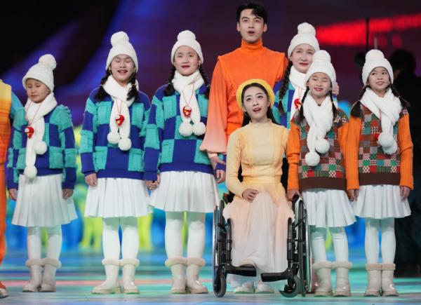 场地内晶莹闪烁,由残疾人和健全人组成的志愿者代表走上舞台,现场用经久不息的掌声,表达着对9000余名冬残奥会志愿者的由衷谢意。