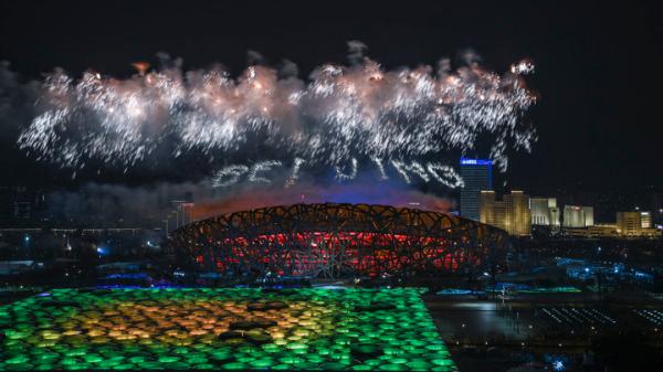 浪漫的焰火腾空而起,“北京2022”在国家体育场上空粲然绽放,时光的“留声机”定格在大地上。