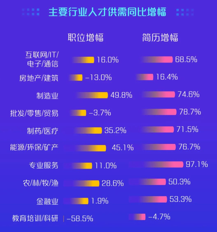 在主要行业人才供需同比增幅方面,职位增幅最大的行业是工业自动化及新能源行业,增幅分别达到110.3%和86.0%;职位增幅为负值的行业包括房地产/建筑、批发/零售/贸易以及教育培训/科研行业。简历增幅最大的是财务/审计/税务等专业服务行业,同比增长约626.3%。