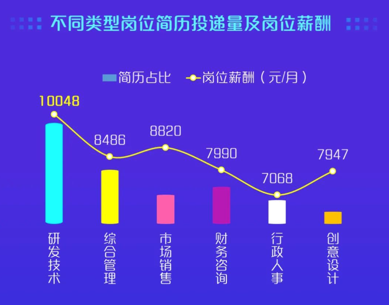 统计发现,研发技术岗薪酬约10048元/月,简历投递量占比最大。占比次之的分别是综合管理岗和财务咨询岗,月薪分别为8486元和7990元。市场销售、行政人事、创意设计岗位薪酬均超过7000元/月。另外,报告显示,女性求职者更倾向于职能型岗位,投递行政人事、财务咨询岗位的毕业生中,女性群体均占据更大比例。