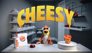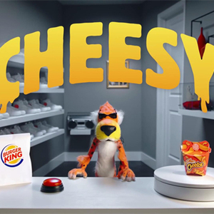 炸成橙色的表皮,里面是黄黄的奶酪,Mac n’ Cheetos乍一看上去和老北京小吃炸鲜奶挺像,一看热量就很高的样子。为了把它打造成爆款,汉堡王还专门上线了一支由奇多吉祥物——Chester豹出镜的广告片。Chester成了戴着墨镜的rap歌手,向人们推介新产品,让人们忍不住跟着唱起来:药药切克闹,油炸奶酪来一套。