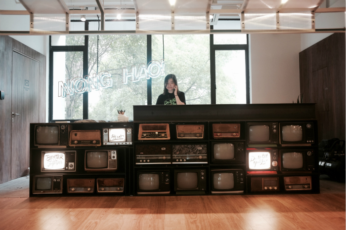 从前台开始,这个以原木色为主色调的空间就流露出一种老上海的怀旧风情。前台的吧台堆砌着上世纪的老旧电视机和录音机,粉红色霓虹灯由“Nong Hao”几个字母构成,在上海话中这是“你好”的意思。