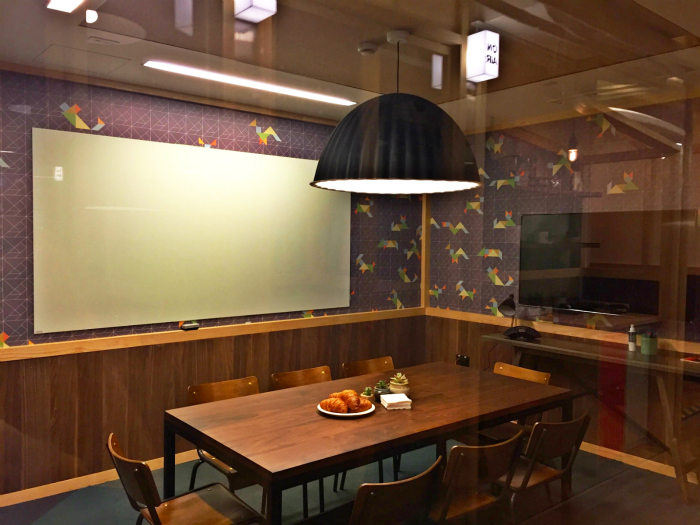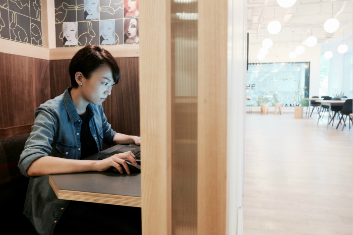 所以在公共区域,你可以看到各种不同的“交流场景”:有舒服的沙发供人随意坐卧闲聊,有适合更严肃交流的包间,有开放式工位,甚至还有一个由钢筋分隔出的小空间——钢筋交错构成置物架摆放着盆栽、装饰品和书,形成屏障,两三个人可置身其中进行私密谈话。当然,如果你想打电话或“一个人静静”,可以到只供一个人就坐的电话间,拉上门,门上方的“On Air”(直播中)灯自动亮起,告诉别人你此刻不想被打扰。