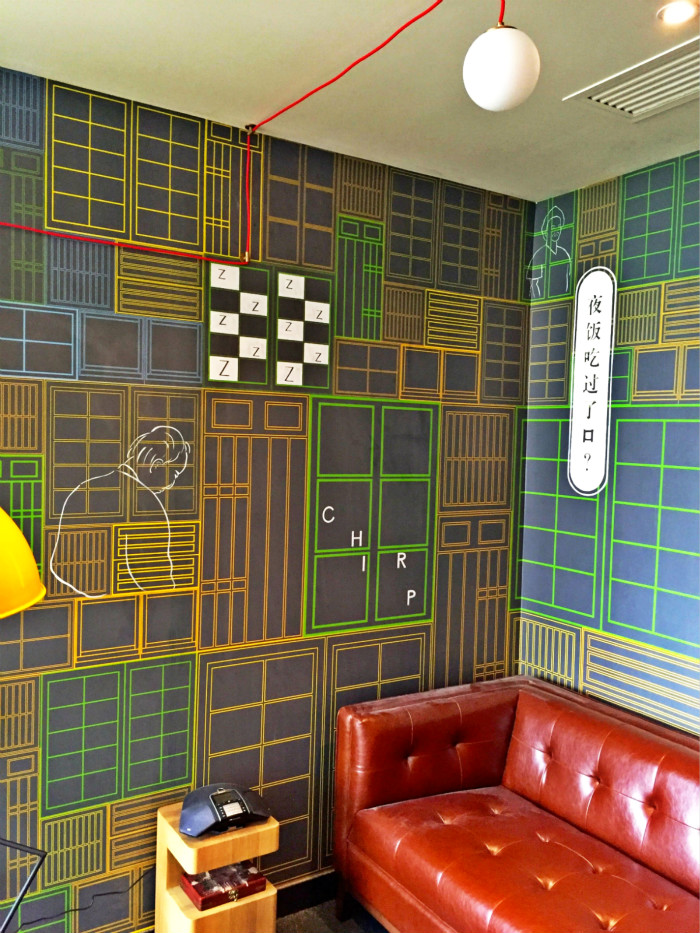 这位在上海生活了两年的外国设计师显然有深入观察过上海人的生活,对中国文化和上海弄堂生活致敬的巧思散落在空间各个角落。从跳蚤市场搜罗来的各式物件除了前台的电视机、录音机之外,还有曾为中国家庭标配的搪瓷杯、搪瓷盆等生活用品。会议室的墙壁上随处可见以中国文化和上海街道风貌为灵感创作的图案或花纹,其中一间会议室为“中国象棋”主题,一间为“七巧板”主题(在会议室中真的有象棋和七巧板可玩!),还有一间的壁纸据纪怀恩透露灵感来自弄堂的各式窗户,上面还有一句上海话“夜饭吃过了口?”。