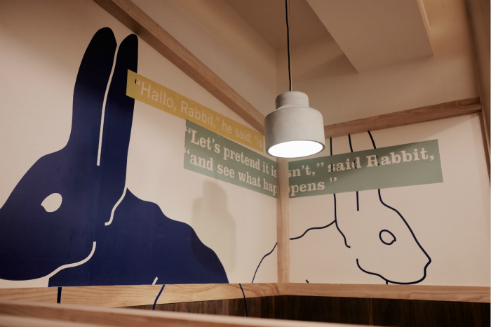 电话间、打印间和休息间等公共区域的墙壁则是以兔子为主要意象——打印间架子上放着的一只大白兔奶糖铁罐泄露了它的灵感来源。公共区域的墙上挂着一幅描绘上海里弄生活的版画,画中的行人都在“遛兔”。