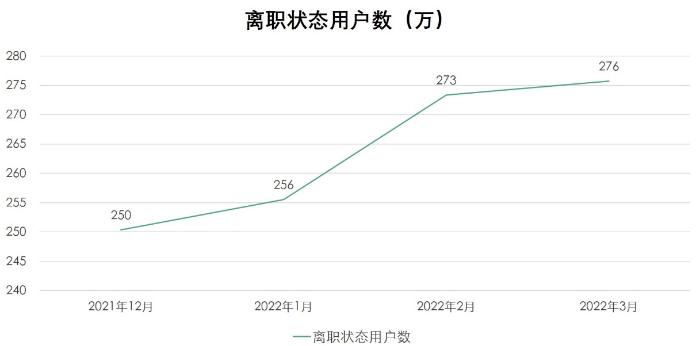 自2021年年底起,互联网行业人员优化趋势加剧。从去年12月到今年3月,拉勾招聘平台上处于离职状态的用户数量不断增加。数据显示,2022年1月,离职人数约256万;进入2月后,离职用户数量急剧上升,达到273万;至3月,离职状态用户超过276万,相比去年同期增长2.1%,求职者压力进一步加大。
