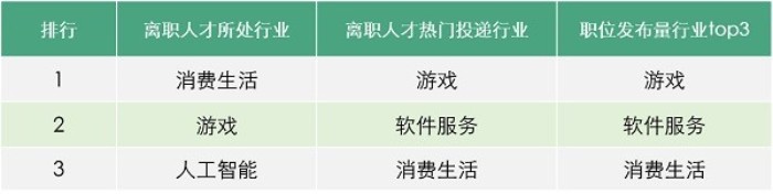 值得一提的是,处于离职状态的人才所属行业的分布中,消费生活、游戏、人工智能行业名列前茅。就离职人才热门投递行业来看,游戏行业位居第一,软件服务和消费生活紧随其后,而这与发布职位量排名前三的行业完全吻合。