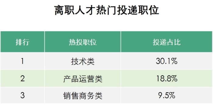从离职人才热门投递职位来看,排名第一的是技术类岗位,投递占比达到30.1%。约两成用户投递产品运营类岗位,而销售商务类以9.5%的投递占比排名第三。