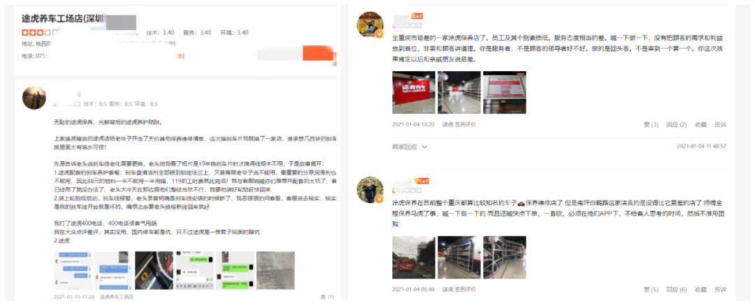 “强管控”并不能彻底解决加盟商、合作店服务体验和产品质量问题。在多个社交、点评和投诉平台,与途虎养车相关的投诉难以统计,保养水平、服务态度、配件质量等方面都是投诉重点。同时,除了用户投诉工场店,也有不少加盟商投诉途虎养车平台。