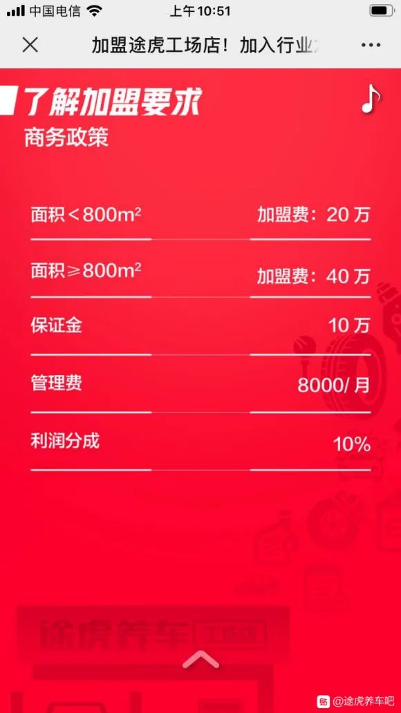 上述两类门店,均需要缴纳10万元押金,并支付8000元/月的管理费,同时月利润分配金额计算比例为10%。在最新专门针对县域的招商加盟宣传中,途虎主要在管理费、利润分成上进行了6个月内的优惠或减免。