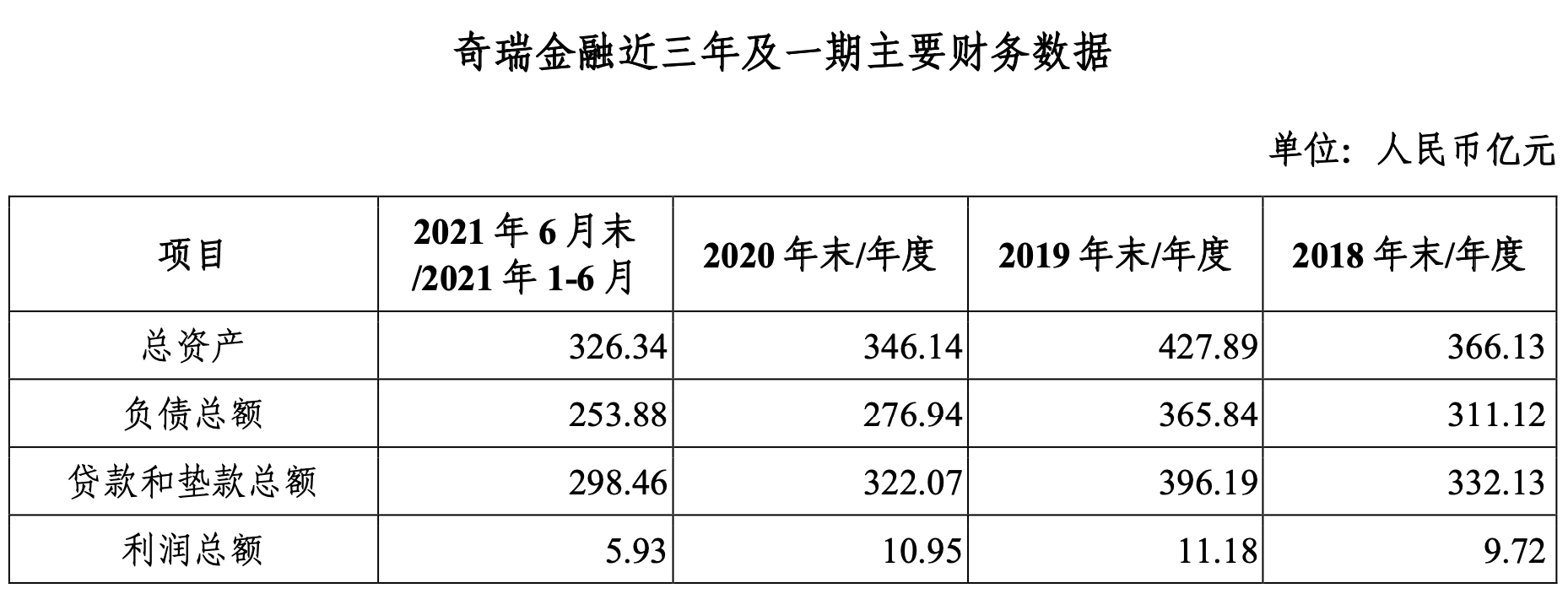 奇瑞金融由奇瑞汽车和徽商银行发起,在2008年6月获批于次年开业。奇瑞汽车和奇瑞控股当前分别持股49%和31%,徽商银行持股20%。