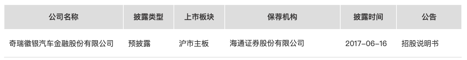 奇瑞金融曾在2015年向港交所递表,六个月后申请失效。2017年5月,奇瑞金融向证监会报送的招股说明书公示。截至目前,奇瑞金融仅预披露招股说明书,尚无其他进展。