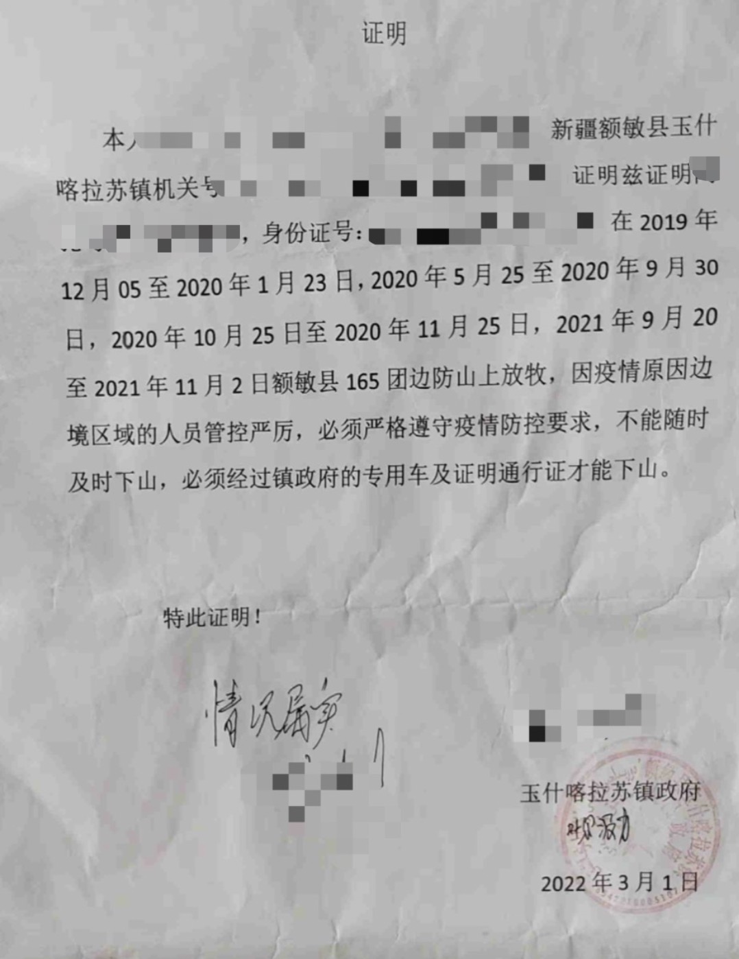 该用户还附上了当地政府于3月1日盖章开具的证明。证明提及,在2019年12月5日至2020年1月23日、2020年5月25日至2020年9月30日等合计四个时间段,因疫情原因边境区域人员管控严厉,人员不能随时下山。