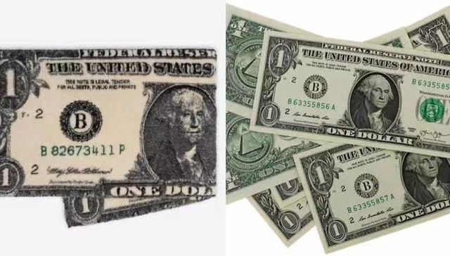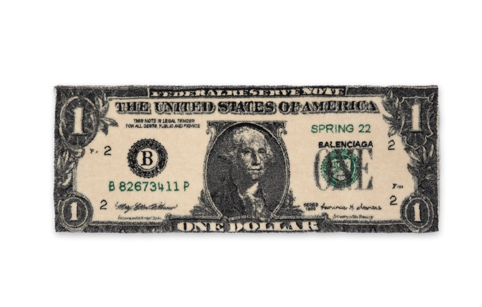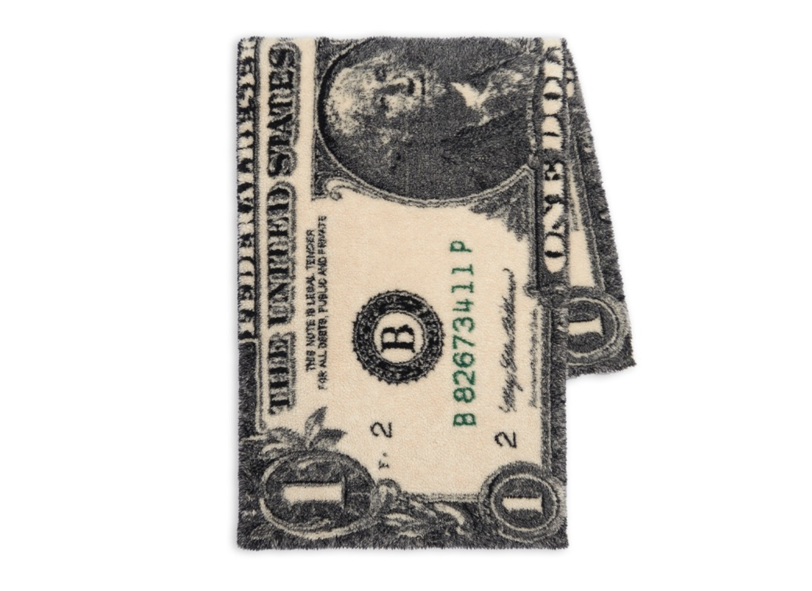 意大利制美钞围巾采用深绒人造皮草饰面,正面饰有George Washington肖像,与Balenciaga品牌logo细节,从有关政府条文到左侧的圆形徽章“B”,围巾将Balenciaga的身影藏匿于序列号、联邦信息和刊头之间。