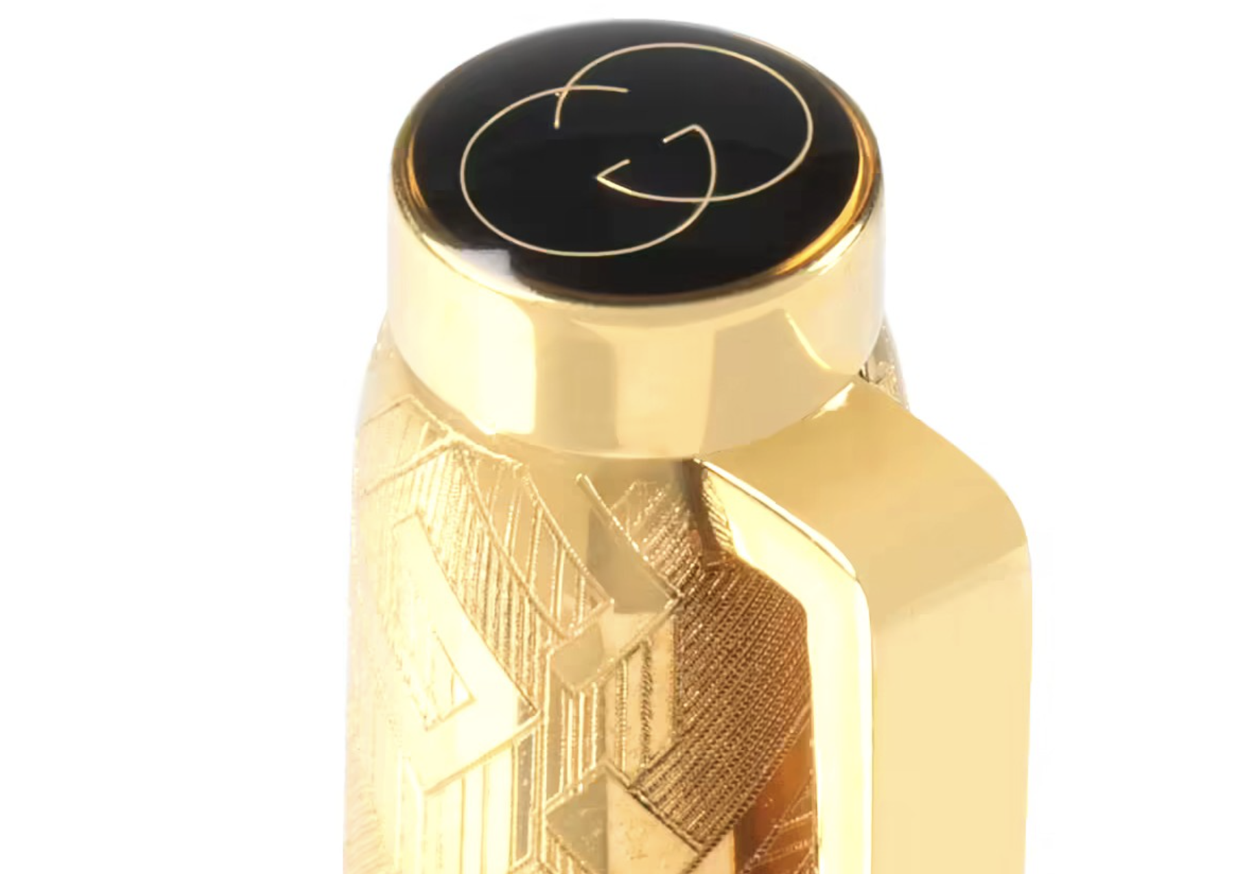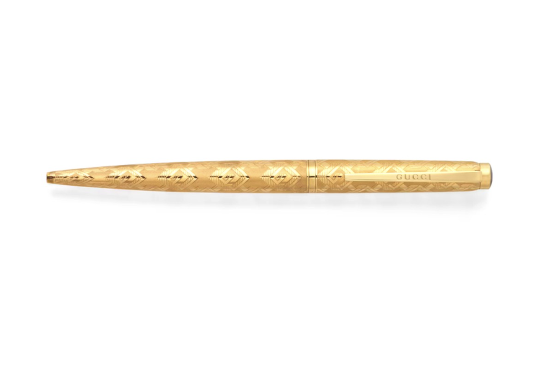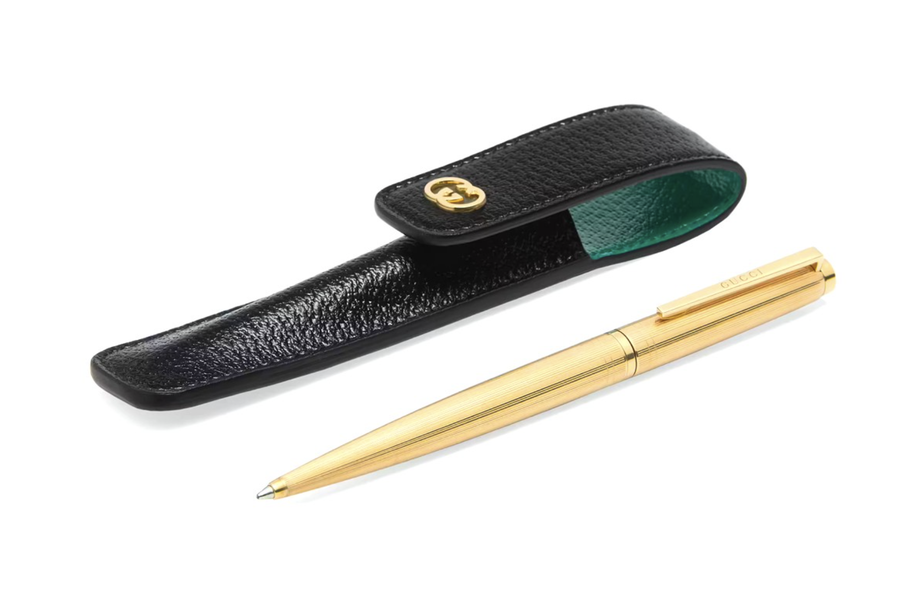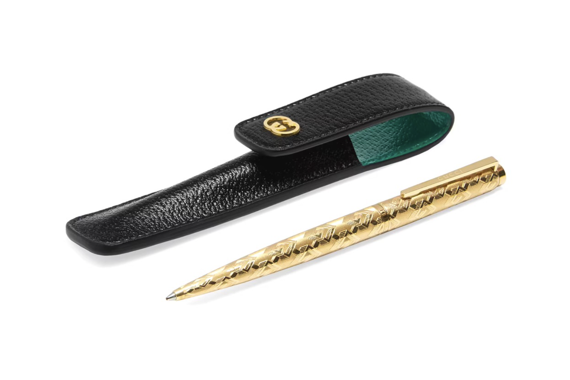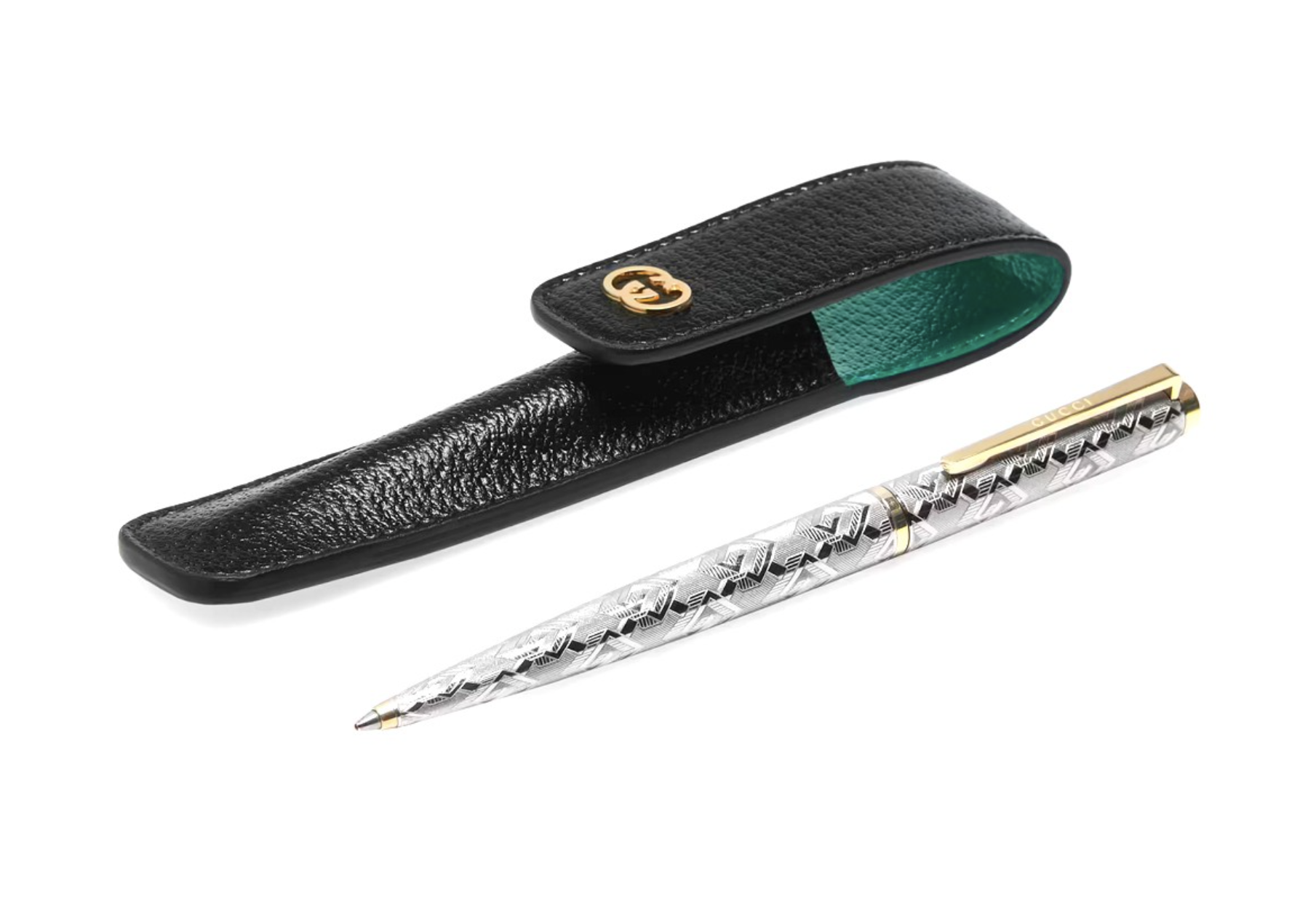 “Geometric G”钢珠笔融入Gucci创意总监Alessandro Michele的70年代风格复古风格,笔身采用环环相扣的几何标志印花全刻设计,目前共有金色和银色两种配色。设计亮点包含顶部饰有品牌标志的黑色珐瑯塞和黑色Demetra永续材质的笔套,其为一种可再生的无动物原材料。内衬佐以大气典雅的墨绿色,并于笔套开口处镶上经典双G五金logo。两款均提供黑色、蓝色笔芯的钢珠笔、笔套,以及补充笔芯。