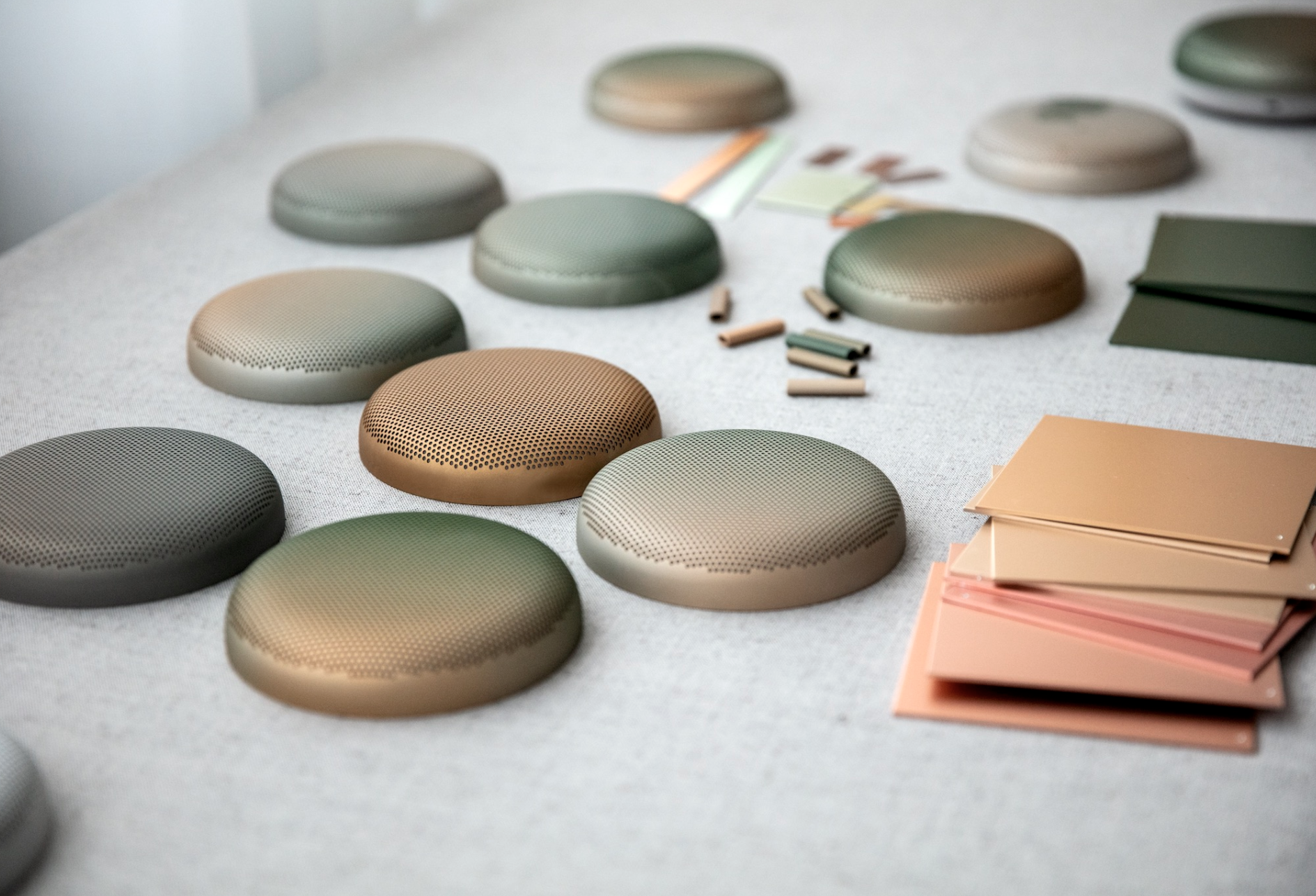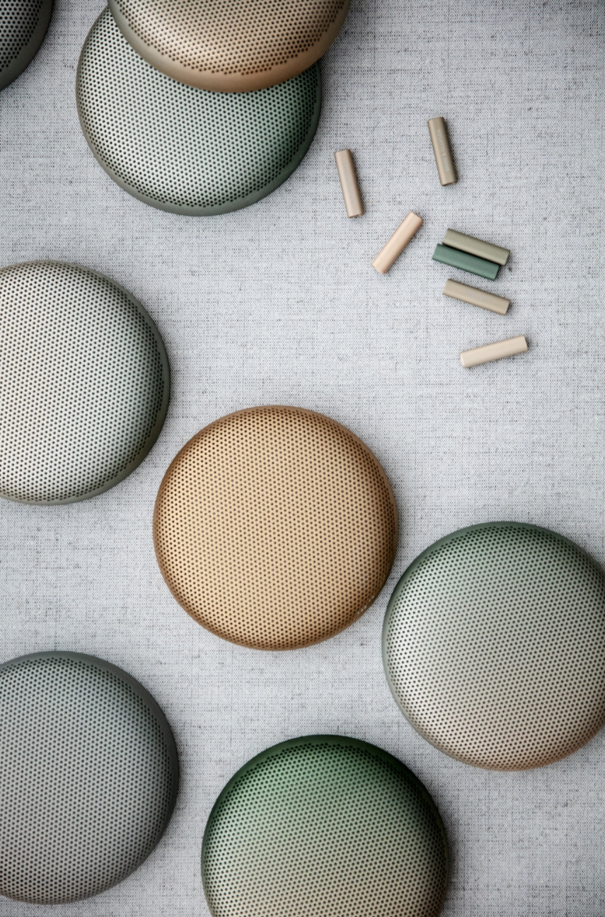 这款扬声器由Cecilie Manz构思出独特的渐变设计,并采用全手工打造,经由Bang & Olufsen专家团队特别开发,运用缓慢而精确的渐变阳极氧化工艺,将两种颜色混合过渡,得到一种独特的渐变混色。为了避免在格栅上留下不必要的流动痕迹,Bang & Olufsen研发团队选择通过金属本身的阳极氧化过程添加颜色,铝合金格栅上的抹茶绿和红米色与扬声器的浅灰色底座融合于一体,饰以皮革手绳,手绳上的铝合金标签一面是激光蚀刻的Bang & Olufsen标志,另一面则刻有产品特有编号。