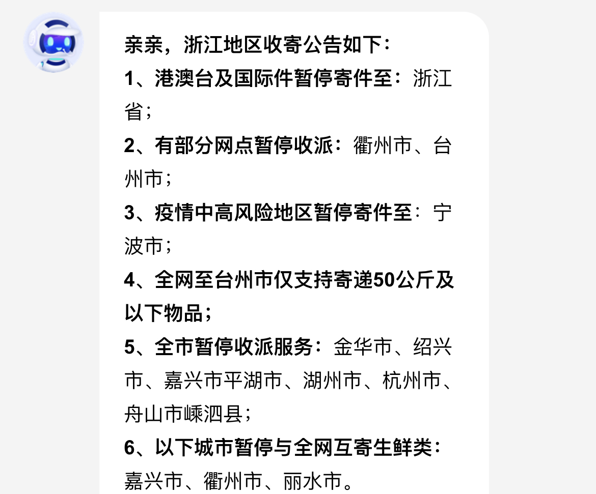 顺丰速运小程序显示,目前顺丰速运在杭州、温州、金华市、绍兴市、嘉兴市平湖市、湖州市、舟山市嵊泗县等地区的收派服务均已暂停,嘉兴市、衢州市、丽水市与全网互寄生鲜类暂停,恢复时间尚未公布。