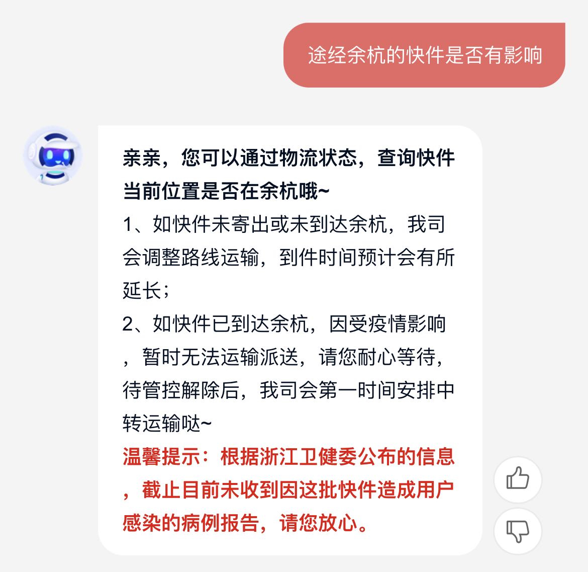 顺丰速运在线客服方面提供的信息也显示,针对未寄出或未到达余杭的快递,顺丰方面将调整运输路线,但快递送达时间或许有所延长。另一方面,已经到达余杭的快递目前因为疫情原因无法配送,需要等到解控后再安排中转运输。