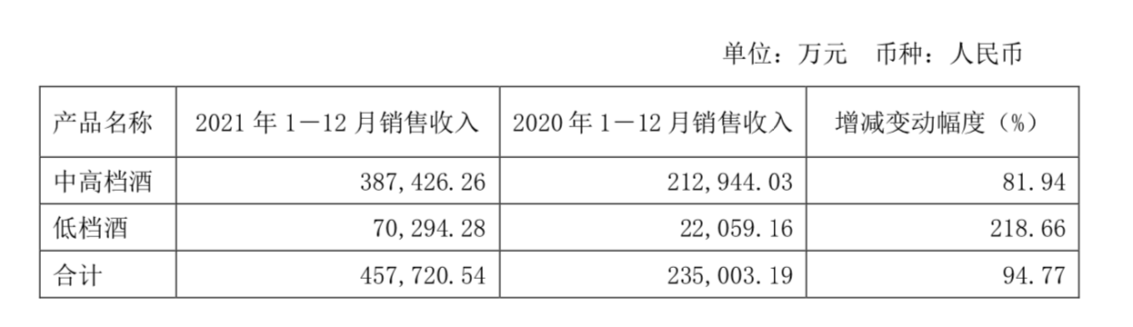 根据公告显示,去年1-12月,舍得酒业中高档酒实现销售收入38.74亿元,同比2020年21.29亿元提升81.94%;低档酒实现销售收入7.03亿元,同比2020年2.21亿元提升218.66%。