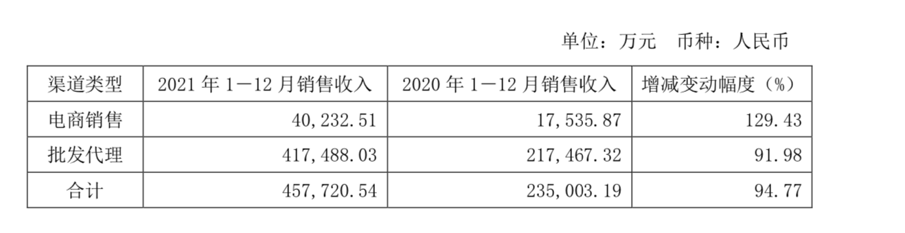 按销售渠道划分,舍得酒业2021年在电商销售与批发代理渠道分别实现销售收入4.02亿元、41.75亿元,同比提升129.43%、91.98%。